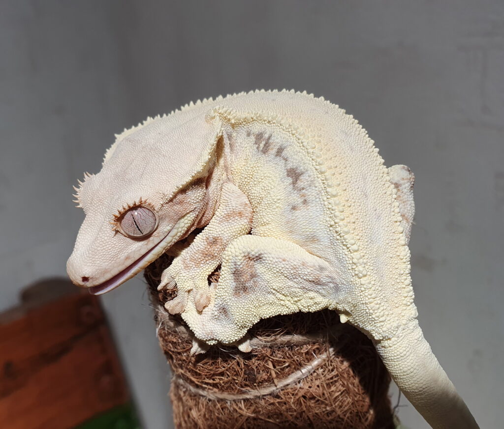 Crested geckos have a unique ocular structure where their eyelids are fused and transparent, forming what’s essentially a permanent protective lens over their eyes. Unlike mammals that blink to keep their eyes moist and clean, crested geckos regularly lick their eyes with their broad tongues to keep them clean and hydrated. This specialized adaptation protects their eyes from debris while eliminating the vulnerability of blinking. The transparent scale covering their eye is called a spectacle or brille, similar to what snakes have. During shedding cycles, this eye covering is replaced along with the rest of their skin, sometimes giving the gecko a temporarily cloudy-eyed appearance.